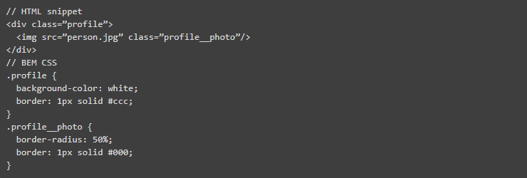 从这个例子中你可以看出,我定义的样式表中 .profile__photo 是与 .profile 嵌套的,但是没有使用嵌套的类。这就是 BEM 最厉害的地方,这也是为什么我推荐使用 BEM 。